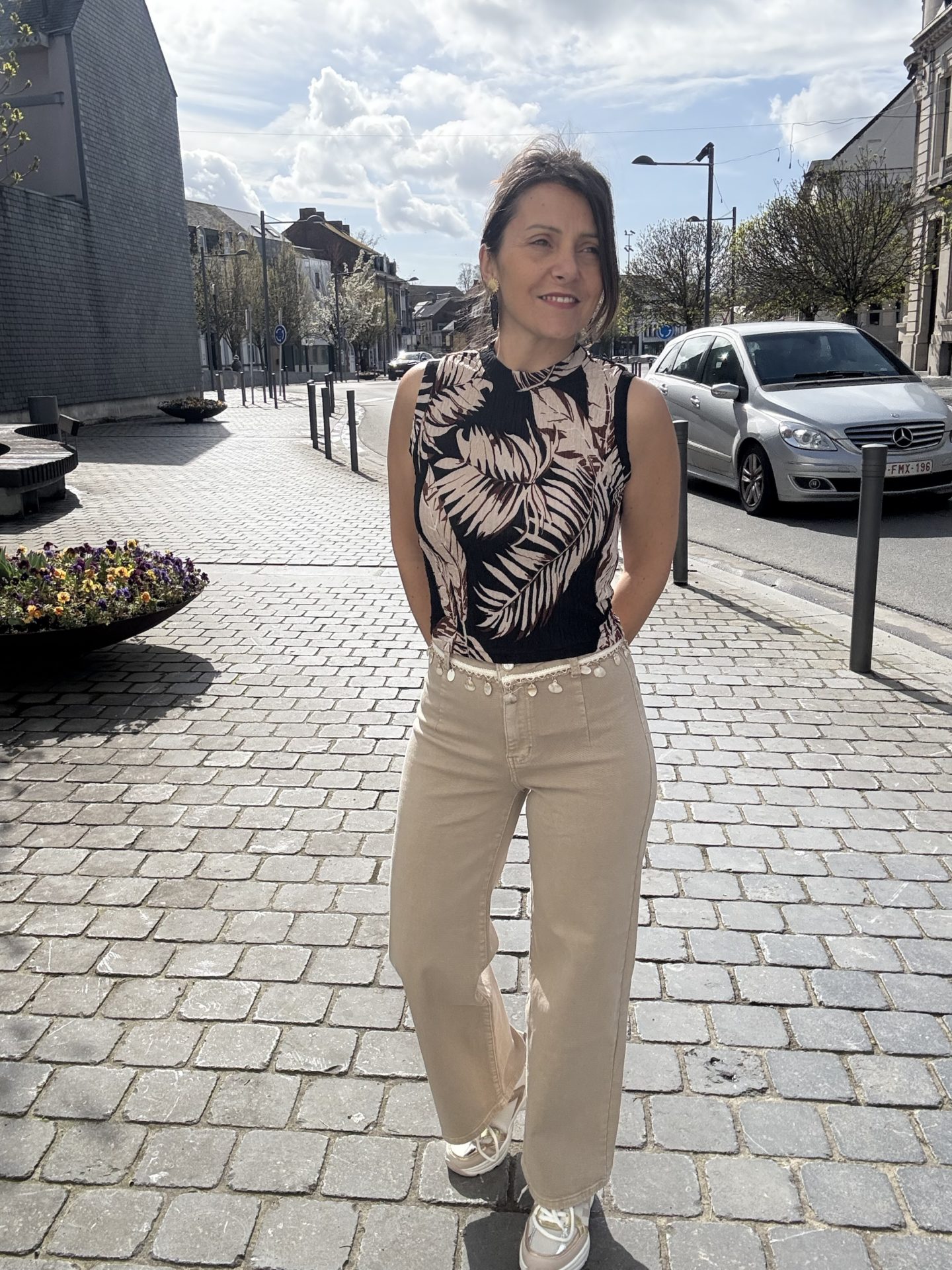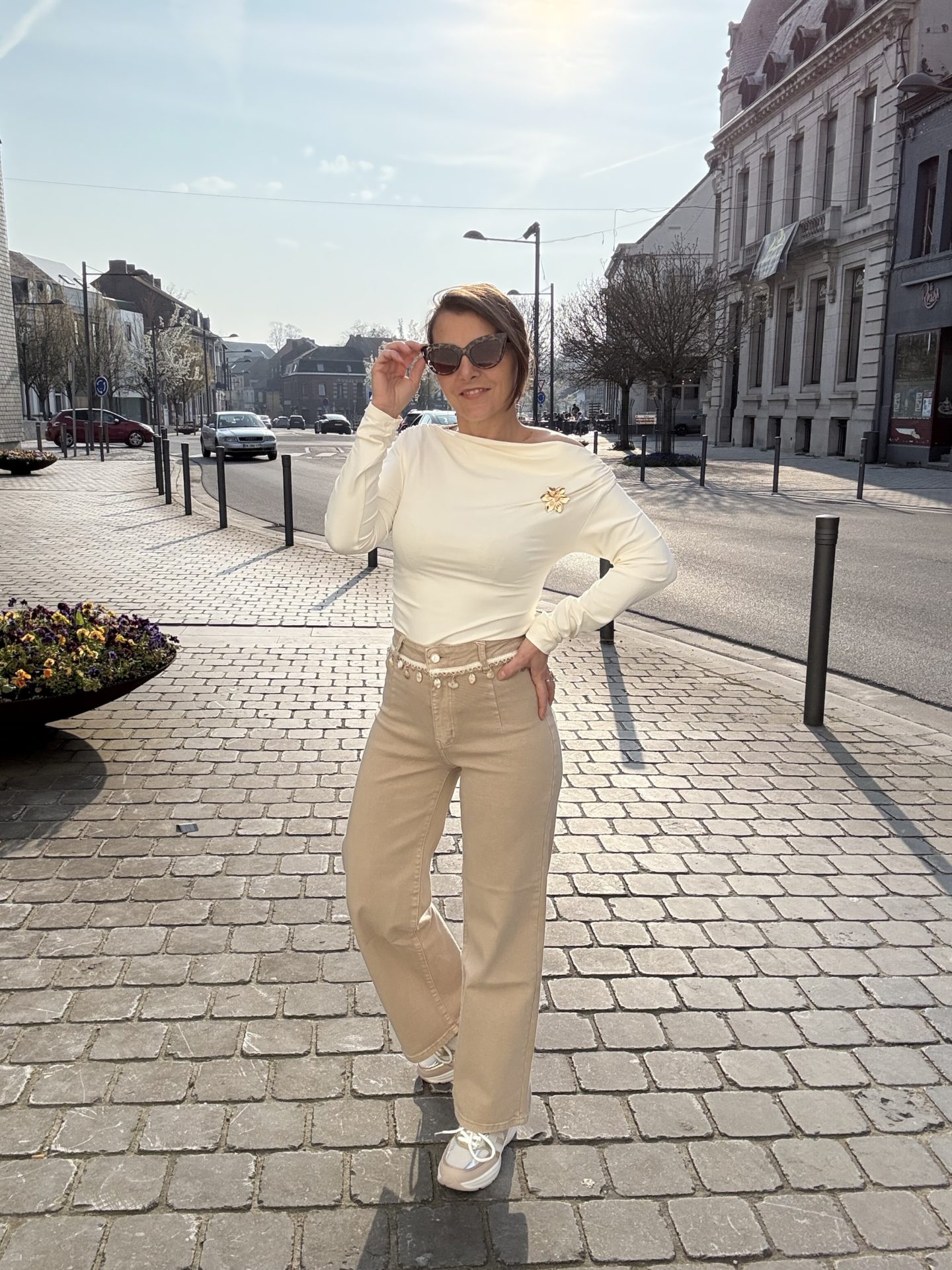 Jeans beige 7/8 eme avec ceinture coquillage